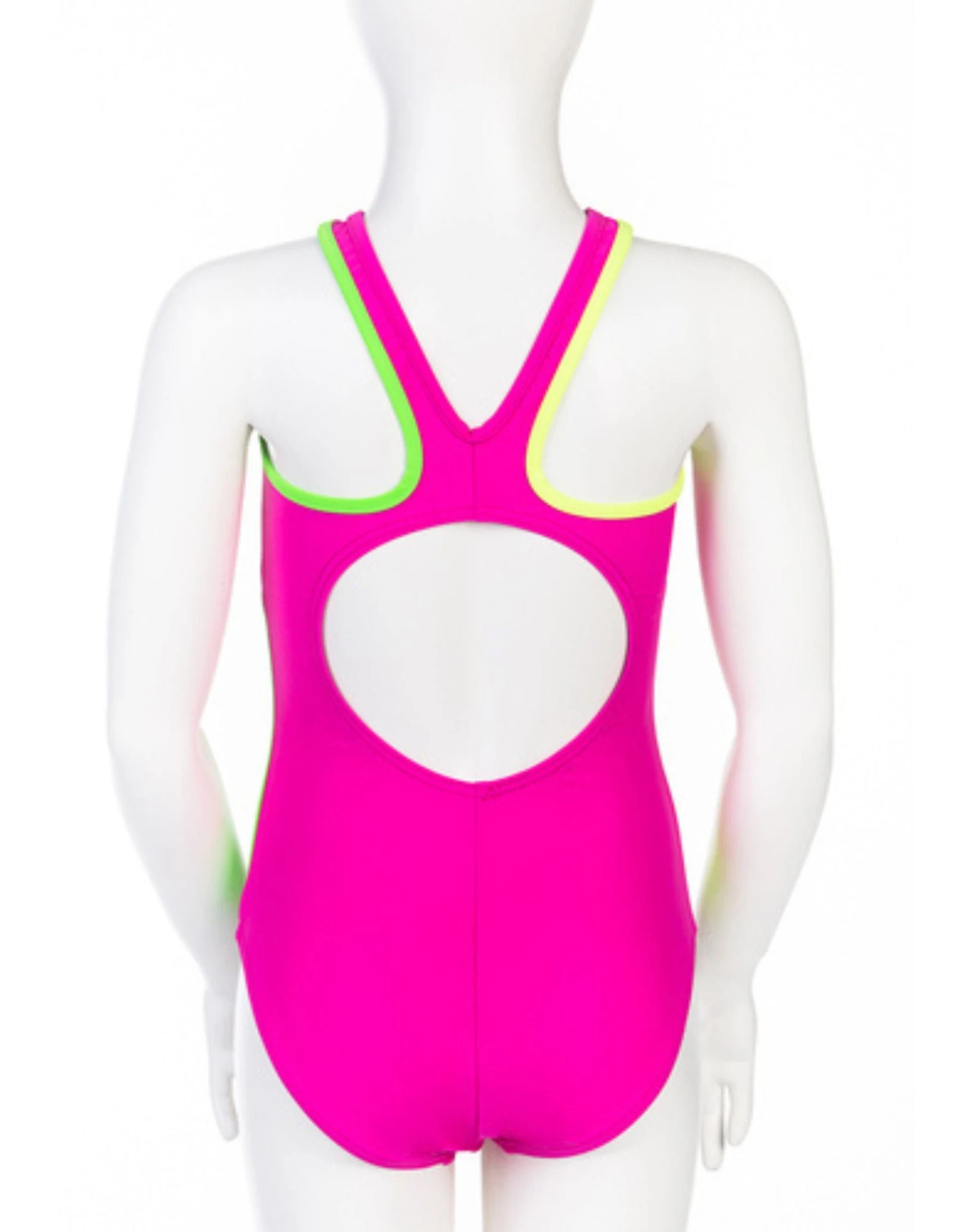 Aquarapid one-piece girl swimsuit, synonymous with the utmost comfort, ideal for training. The neck and arm line with collar make this model look unique. The firm straps keep the shoulder blades free while swimming, it features a medium-sized open back and leg cut for a classic fit and optimal firmness.Â