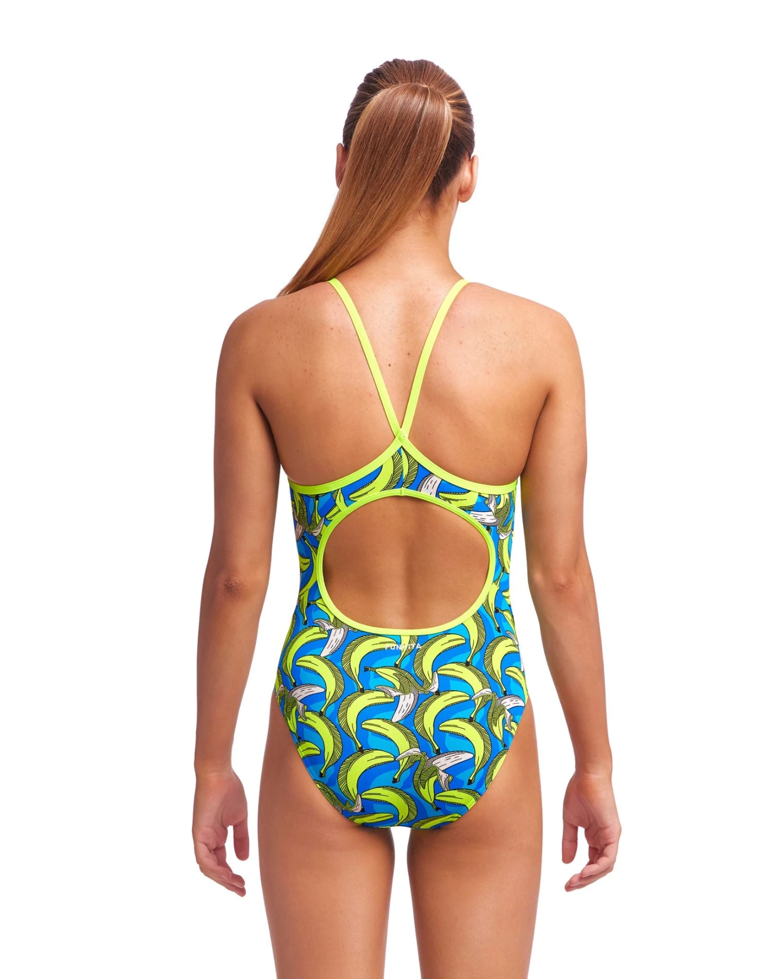 The Girls B1 Diamond Back Swimsuit from Funkita is designed with iconic banana prints. Featuring single-bind shoulder straps, modest rear coverage, and full front lining, it provides greater freedom of movement as well as a secure fit while swimming. Made from exclusive C-Infinity fabric, this swimsuit features high chlorine resistance and great durability and is perfect for frequent swimming and regular training.