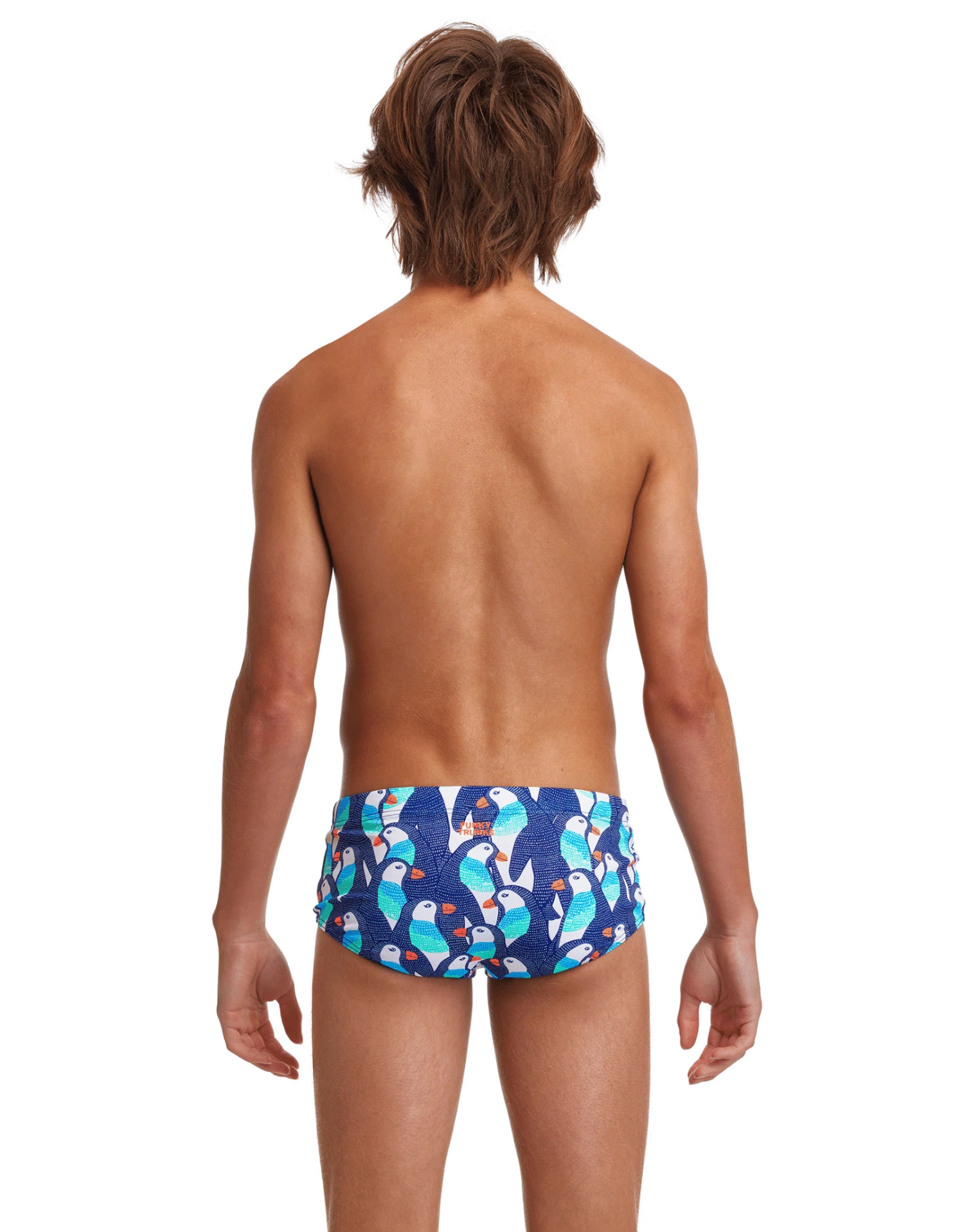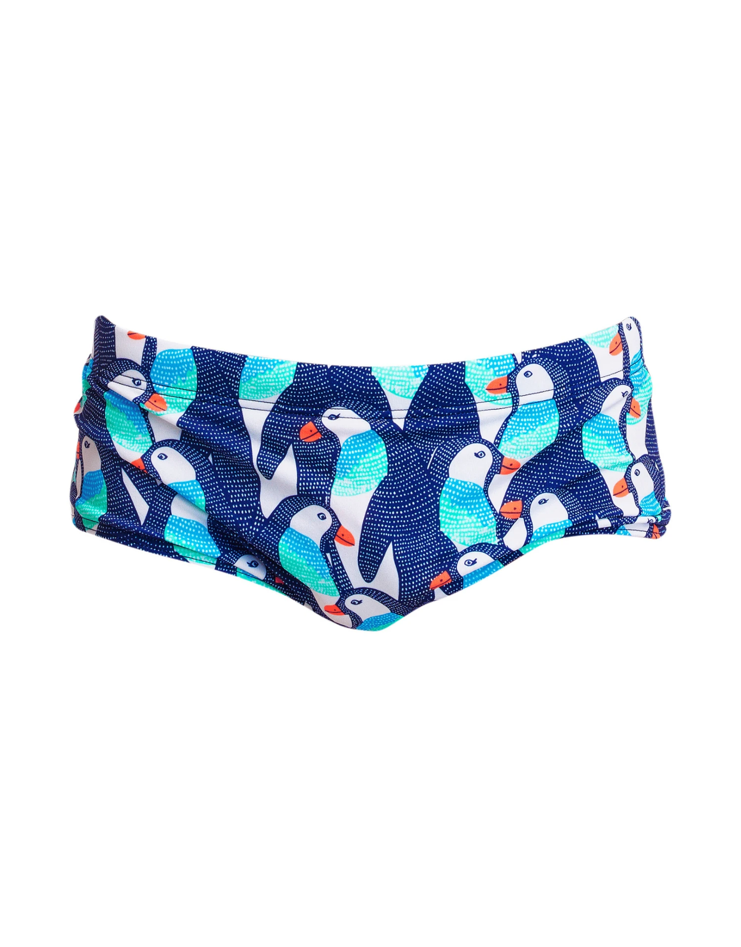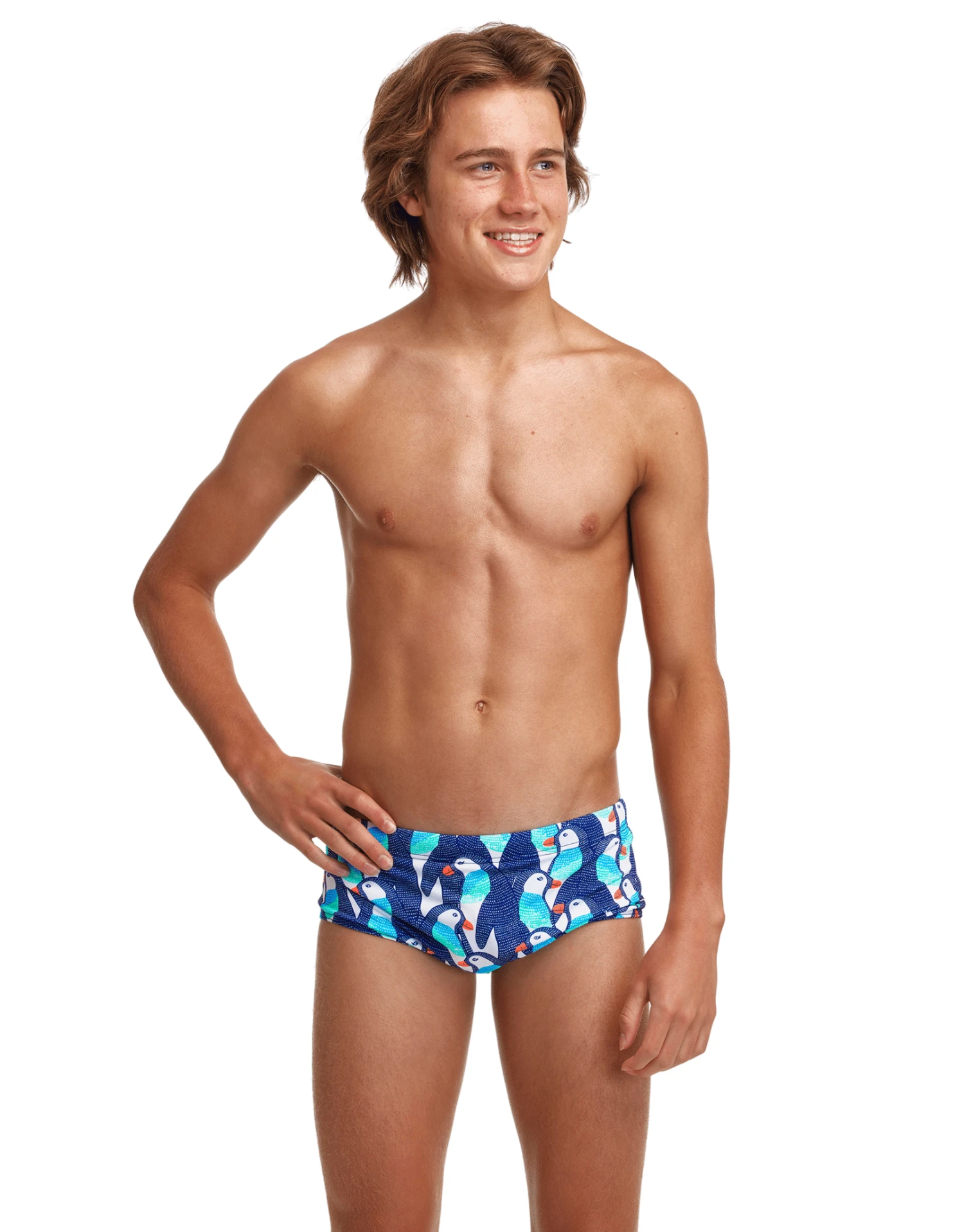 The Boys Pengoo Parade Swim Trunks from Funky Trunks offers a drawcord to keep them locked in position and a wide elastic leg opening and waistband for added comfort around your hips and legs. Well made for durability and comfort, these trunks are made from 100% Italian polyester in Funky Trunks C-Infinity fabric, a 100% Italian polyester that is a colourful breakthrough in chlorine-resistant fabric technology. This design is inspired by penguins in the Antarctic.
