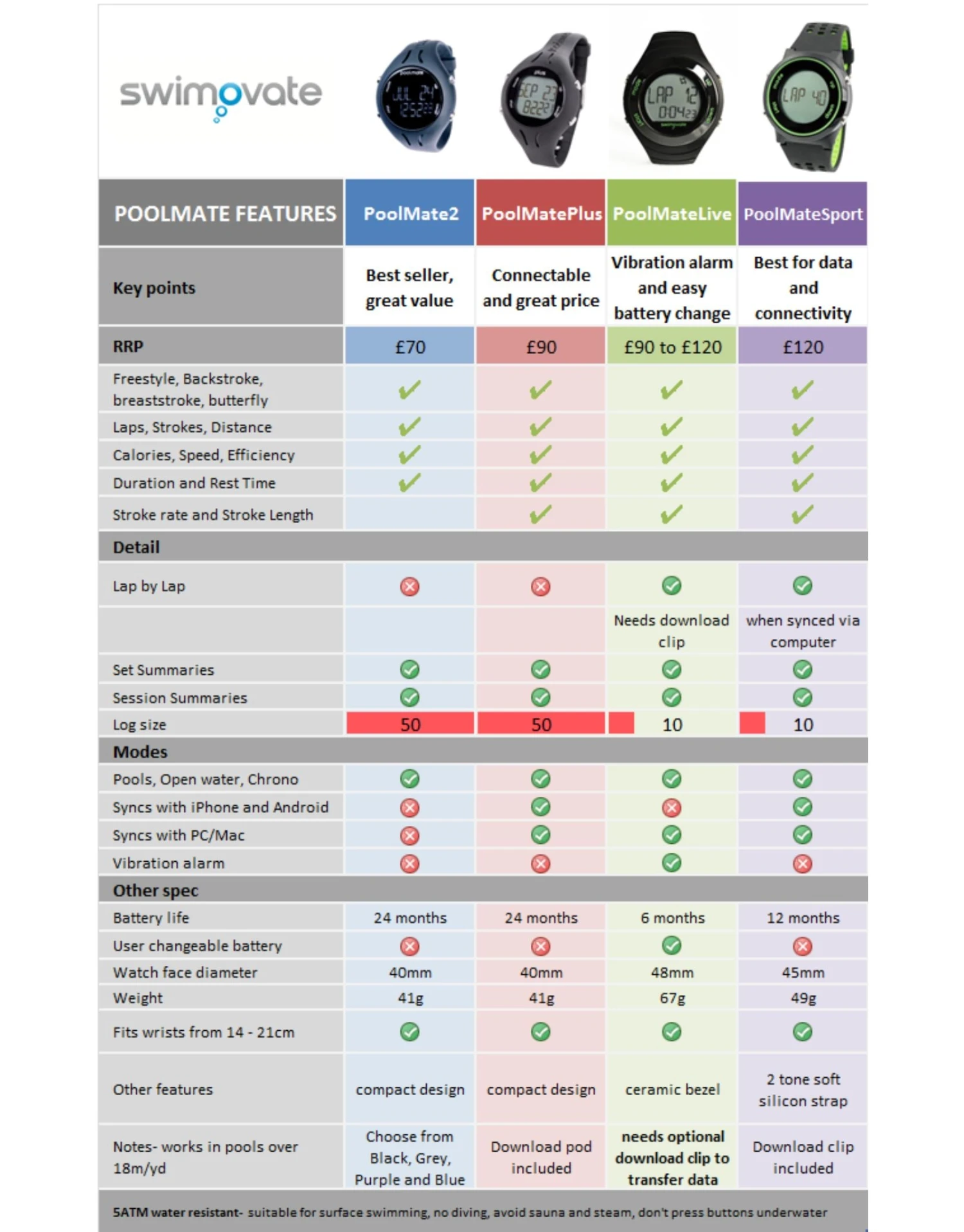 - Automatic lap and stroke counting for each lap- The PoolMateLive has all our swim monitoring functions including laps, strokes, speed, distance, calories, stroke length, strokes per minute, and efficiency which are automatically calculated from your arm movements. In addition to the set-by-set information shown by the PoolMate and PoolMatePro, with the download clip the PoolMateLive downloads data for each individual lap you swim to your PC or Mac.