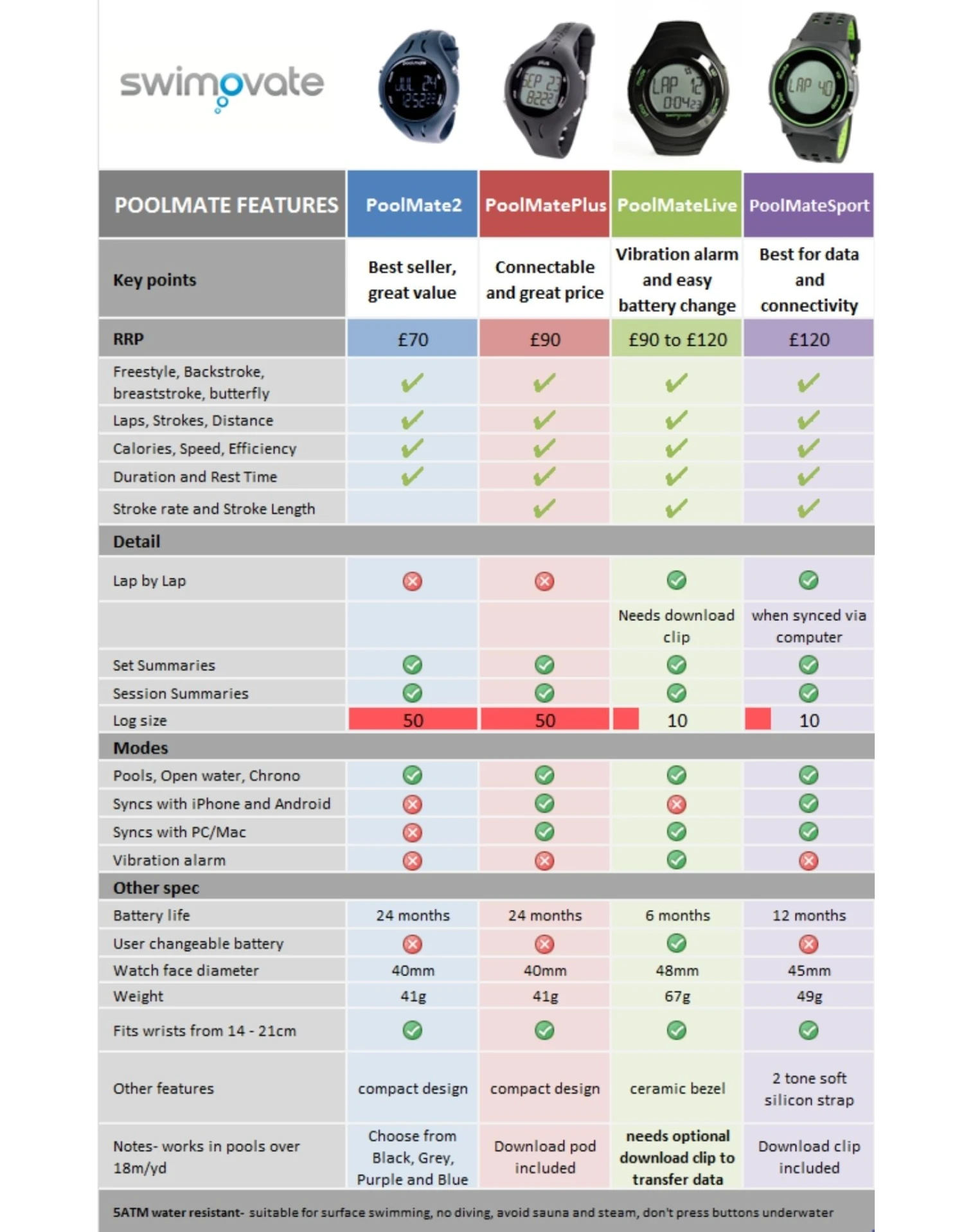 The PoolMatePlus contains a novel use of NFC technology to sync swim data to Android phone or tablet by briefly holding the watch to the device, no pairing is needed. Whether you swim in pools or open water, the PoolMatePlus will track and download your swims. Don’t have an Android phone, no worries, the PoolMatePlus comes with a download pod to plug into your PC or Mac to download your swim data to your computer. A simple calibration lap is all that’s required to set up the special open water mode, which uses the in-built accelerometer to work out the swim metrics. Using this method rather than GPS, which takes a lot of power and has difficulties operating in the water, means the PoolMatePlus has a battery life of over 2 years!