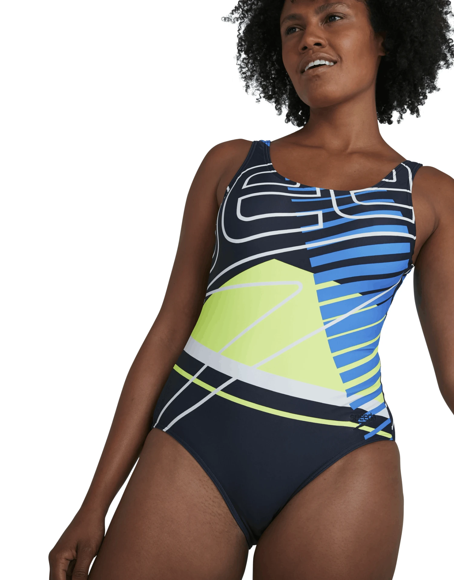 A 90’s inspired Speedo Core Placement U-Back Swimsuit, with racing stripes, blocks of colour, and bold branding. This retro-style swimsuit is perfect for 90’s sportswear revival. Also being made from Endurance10 fabric, it means this swimsuit will last you longer than traditional swimwear fabrics.