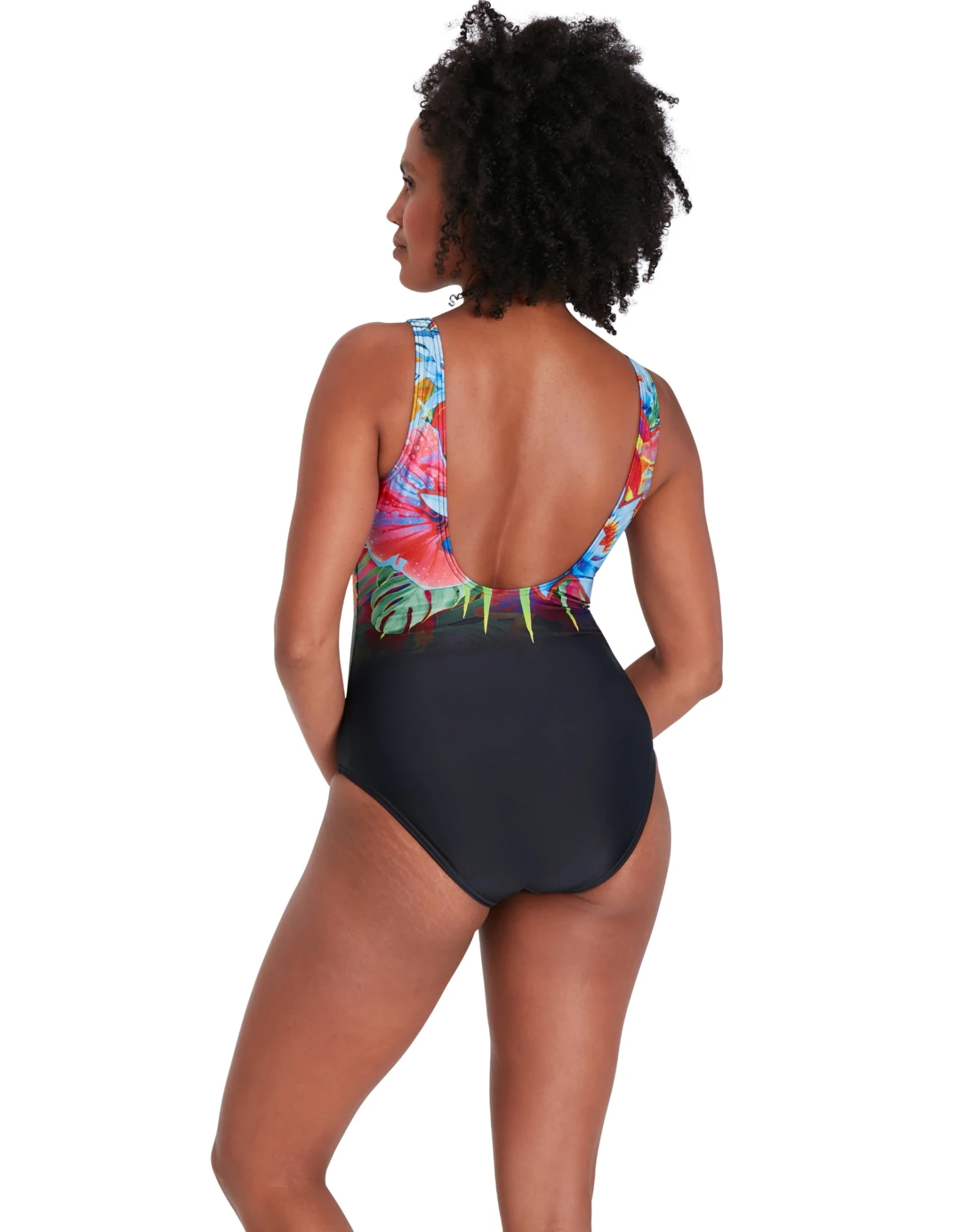 The Digital Placement U-Back Swimsuit from Speedo features a vivid montage of brightly-coloured tropical flowers. Made from ECO Endura Btite fabric, it provides higher chlorine resistance and offers superb colour performance to enjoy the vibrant colours for longer. The swimsuit is designed with a scoop neck and U-back and is perfect for beach escapes and lounging poolside.