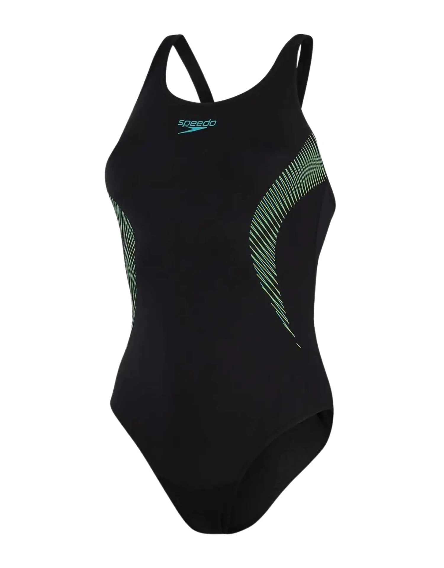 The Speedo Placement Muscleback Swimsuit offers a sporty look, with its muscleback design and chevron panelling, inspired by the Fastskin collection. This swimsuit is soft and stretchy and will fit like new for longer, perfect for regular swimmers.