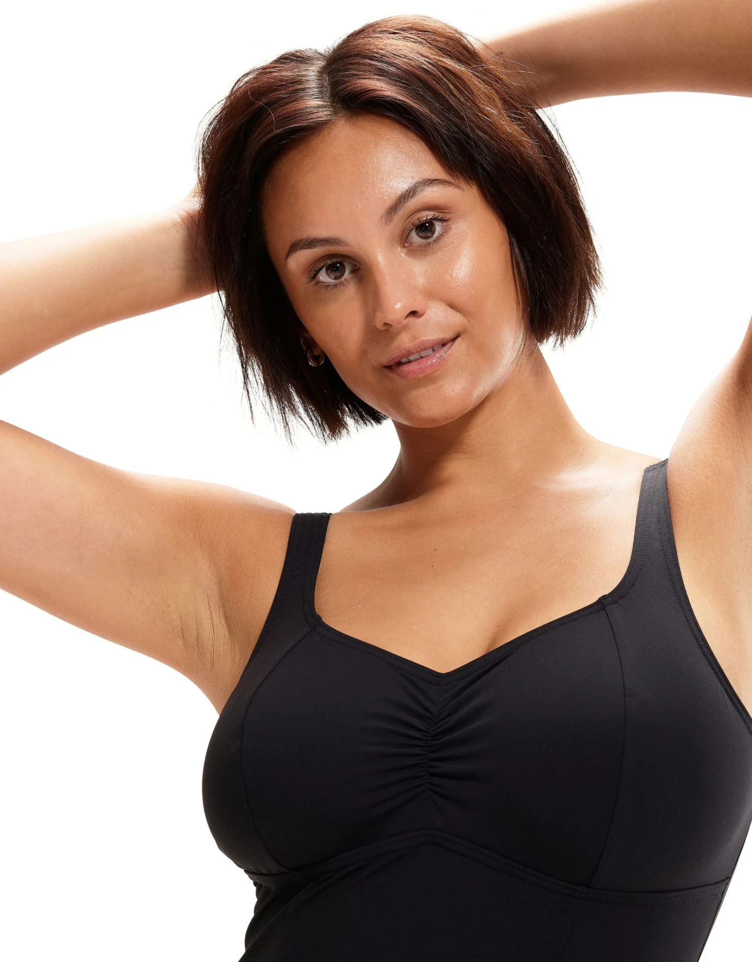 The Shaping AquaNite Swimsuit enhances and flatters your figure in a timeless and elegant black with gentle ruching and a soft V-neckline design. Offering medium bust support, the hidden bust shelf liner and adjustable straps ensure a great fit during your swim, while the all-over shaping fabric provides support where you need it. Made from 100% pre-consumer waste fabric, ECO SHAPE COMPREX ULTRA fabric and includes LYCRA® XTRA LIFE™, which is ultra-chlorine resistant and lasts twice as long as standard swimwear fabrics.