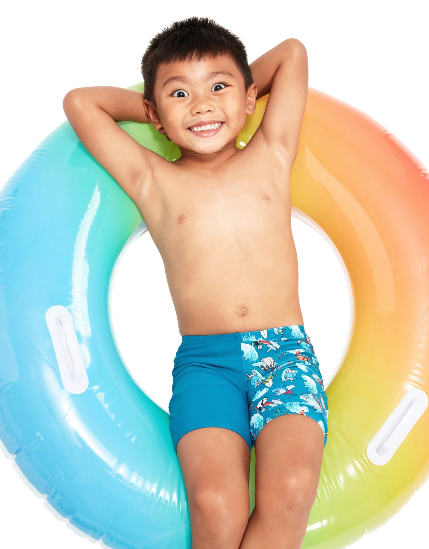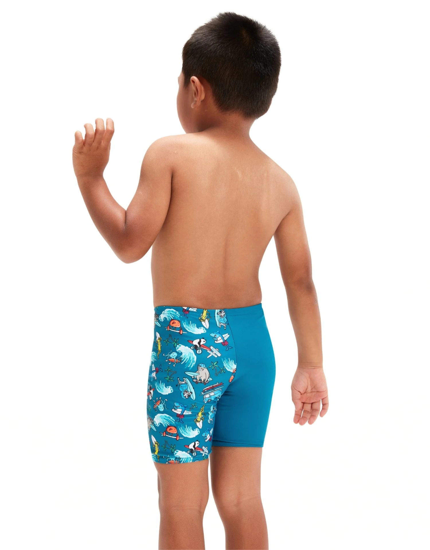 The Speedo Boys Digital Allover Jammer in Pluto Blue boast a lively design with surf-loving characters as they head to Bondi Beach. Ideal for the pool and the beach, this jammer style offers more coverage than shorts and fits just above the knee. The soft and stretchy Endurance10 fabric paired with Creora HighClo keeps these jammers fitting like new for longer.