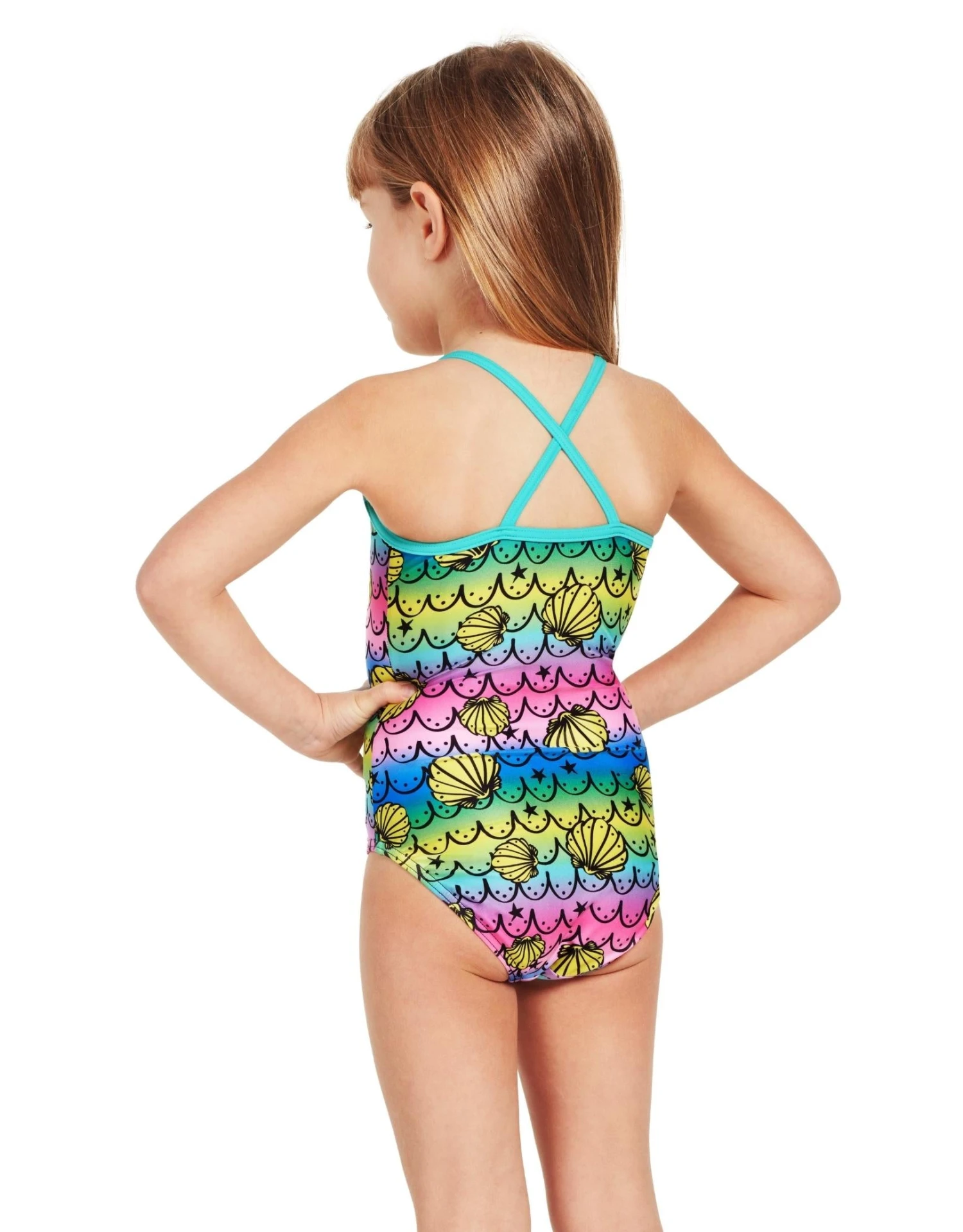 The Tots Girls Mermaids Crossback Swimsuit from Zoggs has thin straps with a crossback for greater freedom of movement. This stylish swimsuit offers fun rainbow colours and seashells print.