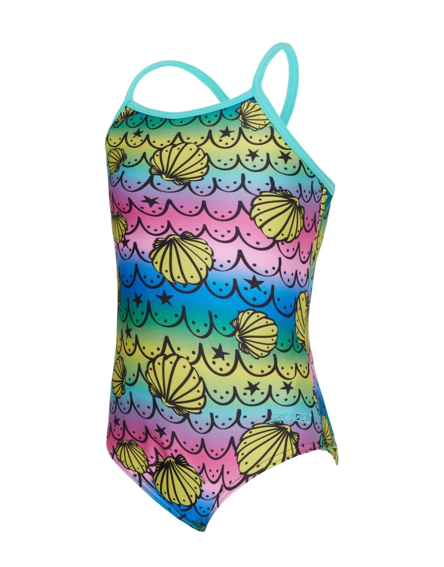 The Tots Girls Mermaids Crossback Swimsuit from Zoggs has thin straps with a crossback for greater freedom of movement. This stylish swimsuit offers fun rainbow colours and seashells print.